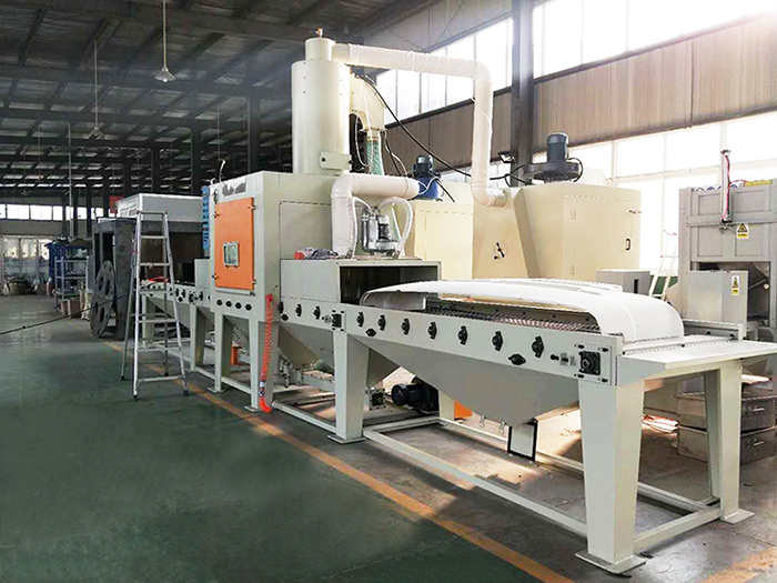 输送式喷砂机原理:本机采用吸入式喷砂,即利用压缩空气在喷枪内高速流动形成负压产生引射作用,将分砂器贮箱内的磨料通过胶管吸入到喷枪内,然后随压缩空气流由喷枪高速射到工件表面,达到喷砂的目的。 脉冲除尘:在离心风机产生的负压吸引下,粉尘与气体的混合物从除尘器的入口有效进入除尘器,当混合物到达滤芯时,气体穿过滤芯表面进入风机入口,粉尘附着于滤芯表面,从而与气体分离。除尘箱配有电脑脉冲控制仪,每个滤芯都配制一根反吹近和一个脉冲电磁阀,在机器工作时电脑脉冲控制仪发出脉冲信号通过电磁阀依次对各个滤芯反吹,使滤芯表面的粉尘脱落,进入集尘箱。